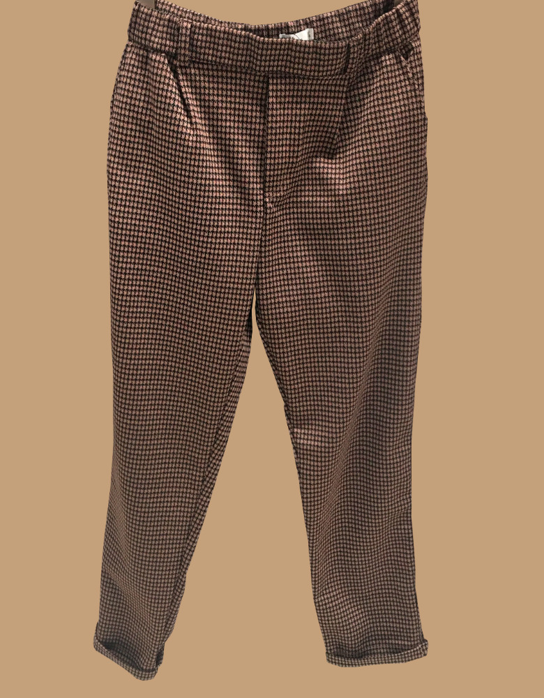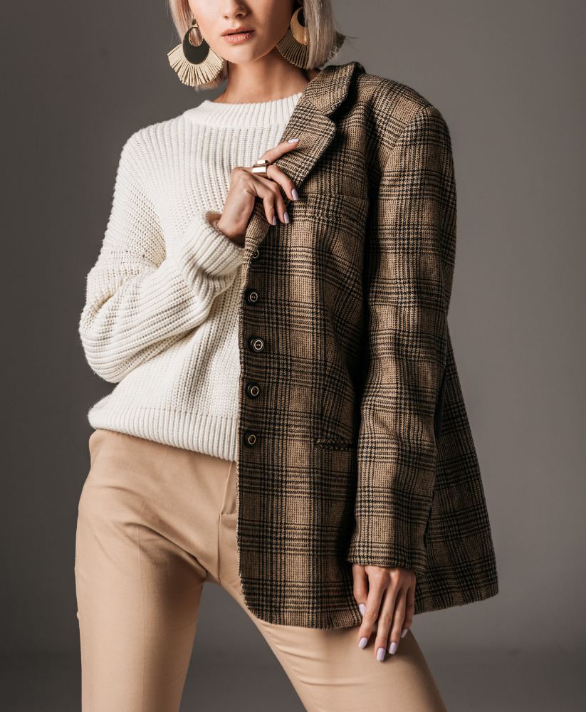 アウターはチャック柄でブラウンカラーのツイードジャケット。