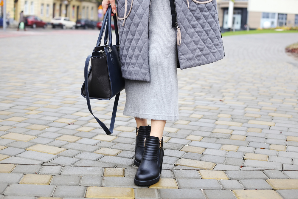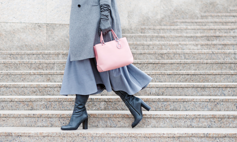 グレーのコートとブーツに、薄いブルーのスカートと薄いピンクのバッグ。