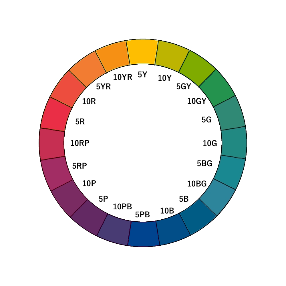 これらを合わせて10色相を、このマンセル表色系では定めています。